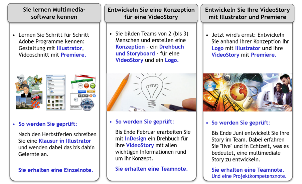 Aufbauend auf Adobe InDesign und Photoshop, welche schon im ersten Lernjahr zum Einsatz kamen, erweitert dieser Kurs das Können mithilfe der Adobe-Programme Illustrator, Premiere und - optional -Animate.
